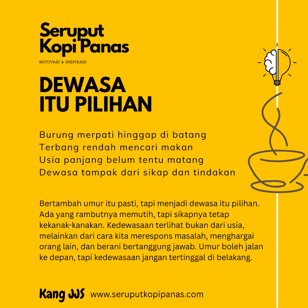 Bertambah umur itu pasti, tapi menjadi dewasa itu pilihan. Ada yang rambutnya memutih, tapi sikapnya tetap kekanak-kanakan. Kedewasaan terlihat bukan dari usia, melainkan dari cara kita merespons masalah, menghargai orang lain, dan berani bertanggung jawab. Umur boleh jalan ke depan, tapi kedewasaan jangan tertinggal di belakang.