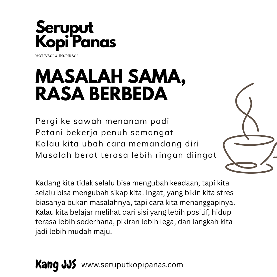 Kadang kita tidak selalu bisa mengubah keadaan, tapi kita selalu bisa mengubah sikap kita. Ingat, yang bikin kita stres biasanya bukan masalahnya, tapi cara kita menanggapinya. Kalau kita belajar melihat dari sisi yang lebih positif, hidup terasa lebih sederhana, pikiran lebih lega, dan langkah kita jadi lebih mudah maju.