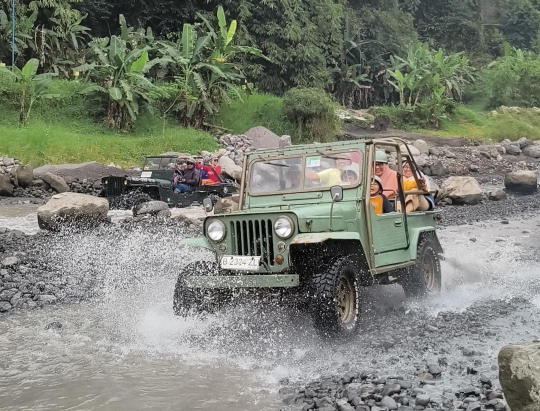 Jalanan awal masih bersahabat, tapi begitu memasuki kawasan bekas aliran lava, sensasinya berubah. Jeep berguncang di atas batu vulkanik, debu berterbangan, dan tawa anak-anak pecah setiap kali jeep menukik tajam. Di sela deru mesin, sang driver bercerita ringan — tentang letusan besar, tentang relawan, tentang keteguhan warga lereng Merapi.