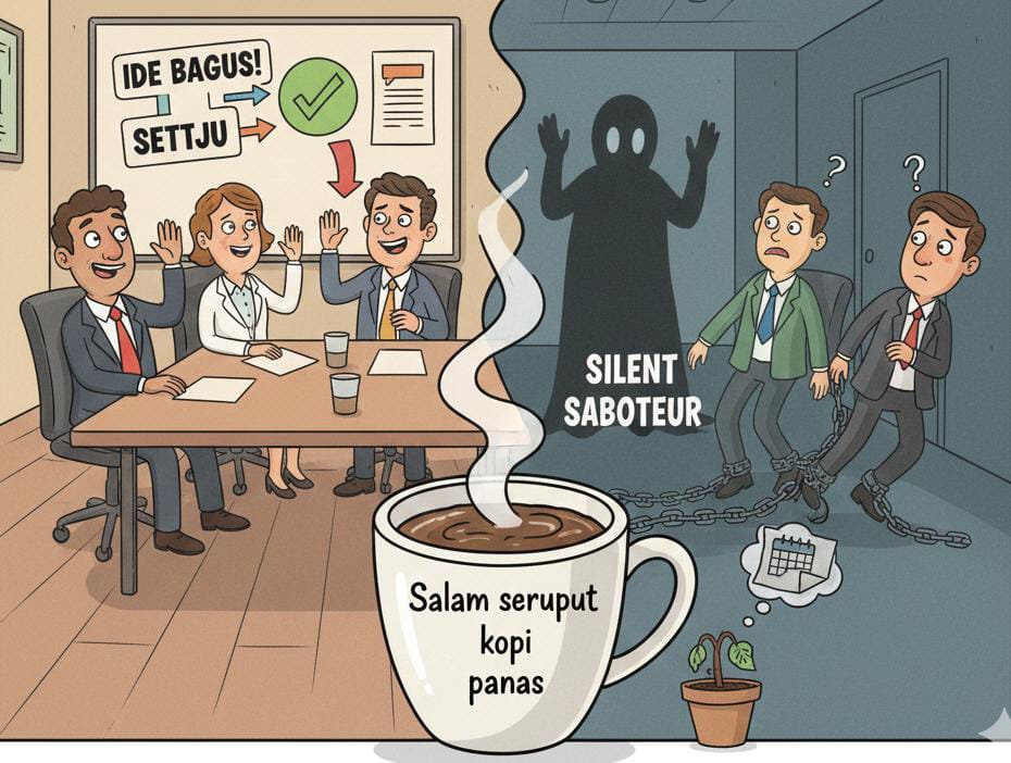 Di situlah istilah silent saboteur menemukan maknanya. Bukan sosok yang keras menentang, bukan pula yang terang-terangan malas. Ia hadir dalam bentuk yang lebih halus yaitu orang-orang yang mengangguk di rapat, lalu tak meninggalkan jejak apa pun setelahnya. Bukan karena tak mampu, melainkan karena tak sungguh-sungguh menindaklanjuti.