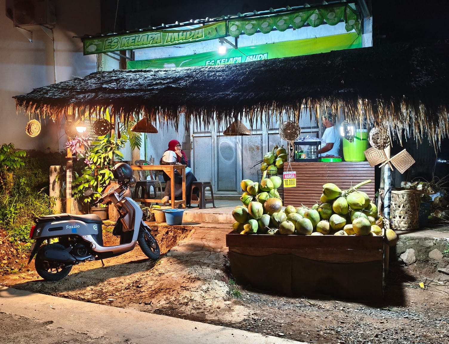 Bangunannya sederhana dengan meja kayu yang sudah berkilau oleh sentuhan tangan, beberapa bangku plastik berjajar, dan lampu kuning temaram yang memantulkan kilau hijau dari tumpukan kelapa muda di depan. Motor kami berhenti persis di depan teras berundak kecil, seolah semua ruang di sana memang disediakan untuk singgah yang tak direncanakan.